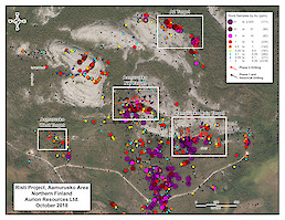 A total of 44 drill holes and 6,297 metres (m) of 15,000 m planned have been completed since early July. Assays have been received for 36 drillholes to date. Assays are pending for an additional 8 drillholes. Four targets were tested including Aamurusko Main, Aamurusko West, Aamurusko NW and A2. Diamond drilling with two drills continues at Aamurusko Main target area. A third drill has been added and is anticipated to arrive in 7-10 days. A summary of assay results received to date are presented in a table and further discussed below. Maps and sections can be found on Aurion’s website by clicking the following link https://aurionresources.com/site/assets/files/1256/nr221018figures.pdf.