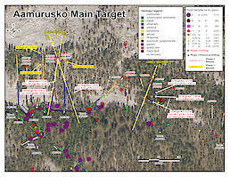 Drilling continues to intersect quartz veins occurring proximal to the sheared contact between clastic sediments of the Kumpu Group and a gabbro sill on the contact between the Kumpu Group and mafic and ultramafic volcanics of the Sodankyla Group, immediately north of the Aamurusko boulder field. However, current structural geological interpretation indicates a complex mineralizing system, which is often typical of orogenic gold systems. With only 10 drillholes into the main target and assays received for only 5, the structural controls on mineralization are still not fully understood.