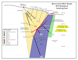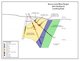 Drillhole AM18053 intersected a 3.5 m wide breccia vein zone from 102.00 to 105.50 m in clastic sediments with anomalous gold values throughout including 3.07 g/t Au over 0.53 m. No significant quartz veining was encountered at the gabbro contact. A new zone of gold mineralization comprising quartz carbonate veins and stringers with several percent arsenopyrite, galena and sphalerite was intersected at 196.1 to 203.7 m depth in the gabbro. The best assay result was 4.76 g/t Au over 1.2 m including 9.12 g/t Au over 0.5 m.
